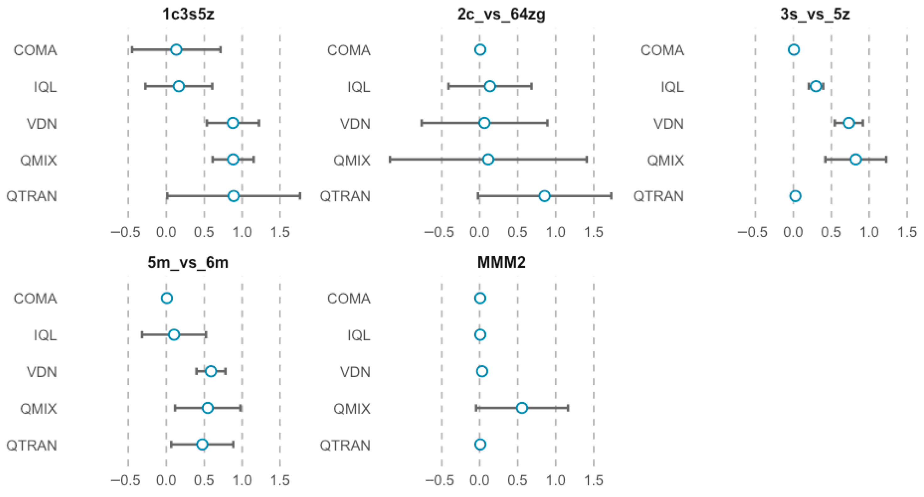 - IC3. The map curves include results for ≥4 of the five selected algorithms: IQL, VDN, QMIX, COMA, and QTRAN.