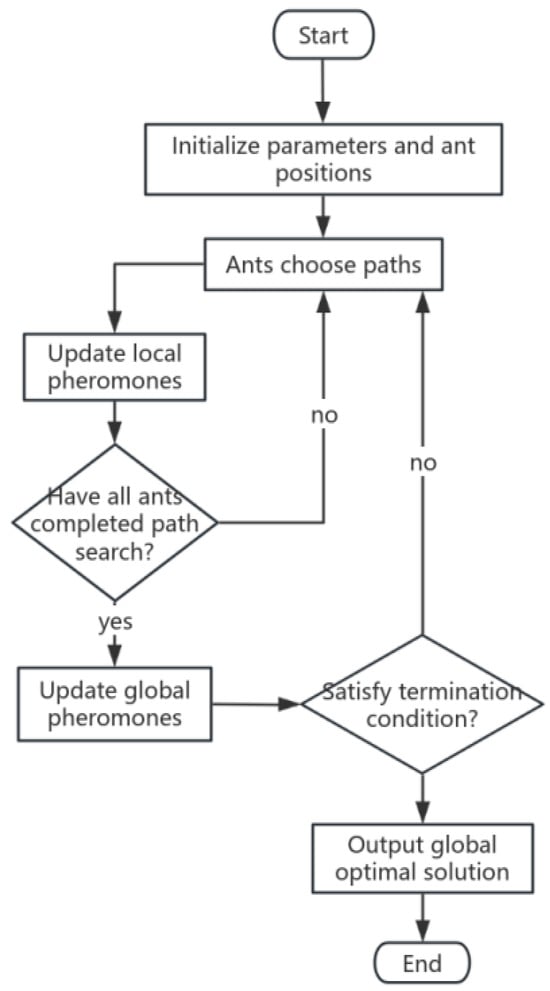 where δ is the local pheromone update factor, and is the initial pheromone concentration. Figure 1 is a flow chart of the Ant Colony Optimization (ACO) algorithm.