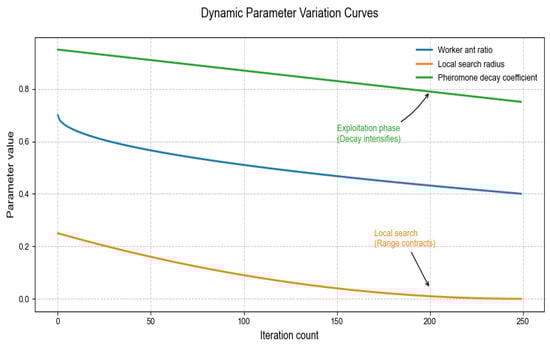 After initializing the population, an evaluation of the initial fitness will be performed, and the best adapted particle will be noted as the global optimal particle (i.e., the best particle in history) at the location . Then, the main iterative loop will be entered, and the parameters will be updated at the beginning of each iteration. In order to balance the development and exploration ability of the algorithm, the proportion of worker ants decreases with the increase in the iteration number; the local search radius decays with the square of the iteration number, focusing on local optimization in the later stage; the pheromone decay coefficient decreases linearly to accelerate the pheromone volatilization rate of ordinary particles, and Figure 2 shows the dynamic parameter change curve.