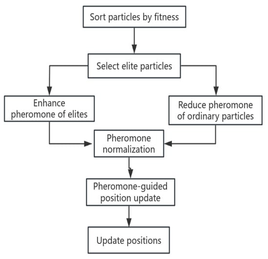 Pheromone update: elite particles enhance pheromones through Equation (14), while non-elite particles undergo exponential decay through Equation (15);