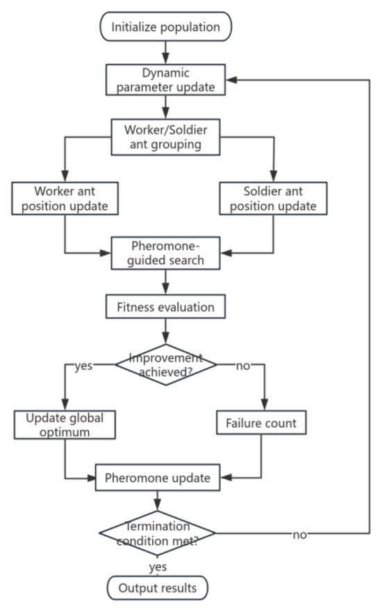 - Division of labor and collaboration framework: we design a worker ant–soldier ant role differentiation mechanism, where worker ants perform local refinement search through pheromone-weighted learning, and soldier ants perform Gaussian perturbation-based global exploration to achieve dynamic allocation of search capabilities.