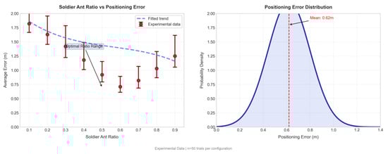 According to the analysis of the graph, when the proportion of worker ants is maintained at about 20% (at the horizontal coordinate 0.2 of the graph), the system reaches the lowest localization error of 0.38 m. At this time, the worker ants achieve accurate localization through directional search and local pheromone guidance, while the soldier ants (80%) with a higher proportion of ants break through the local optimum through Gaussian perturbation to open up new search paths in the complex environment. The density plot shows that the error distribution is the most concentrated at this ratio (the peak density reaches 1.75), indicating the optimal stability of the algorithm. Figure 5 illustrates the effect of the ratio of soldier ants to worker ants on the error.