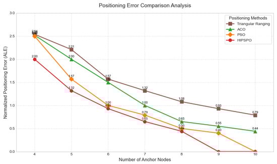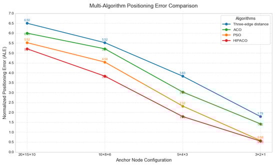 The experiments were conducted by systematically increasing the number of anchor nodes (from 4 to 10), and the four localization algorithms were tested for 100 repetitions and averaged. As shown in Figure 6, the average localization error (ALE) of all algorithms shows a decreasing trend with the increase in the number of anchor nodes, which is attributed to the richer spatial reference information provided by more anchor nodes. It is worth noting that the HIPACO algorithm proposed in this paper always maintains the optimal localization performance under different anchor node configurations: in the most challenging four-anchor node scenario, the localization error of HIPACO is only 1.32 m, which is 42.9% lower than that of the traditional ACO algorithm (2.31 m), the PSO algorithm (1.83 m), and the trilateral ranging method (3.15 m), respectively, 27.9% and 58.1%. Even under the condition of high-density anchor nodes (10), HIPACO still leads the other algorithms with an error of 0.68 m, which verifies its stability and superiority under different network configurations. This advantage mainly stems from the algorithm’s innovative dimension balancing strategy and dynamic pheromone mechanism, which enables it to maintain accurate spatial perception under sparse anchor node environments. Table 1 presents the mean values of ALE for different algorithms in Figure 6.