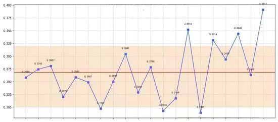 The average normalized positioning error of HIPACO is 1.2275 under four types of spatial ranges, such as 20 × 15 × 10 m3 and 10 × 8 × 6 m3, which is 61.90% lower than that of trilateral ranging (3.2225). Figure 8 shows the error analysis of the HIPSPO localization method in a 10 × 8 × 6 three-dimensional space with anchor nodes set to four. The blue line represents the positioning error of each group, and the red line represents the average error of this algorithm: