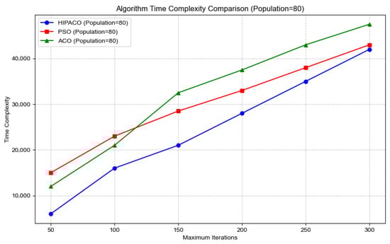 In practical applications, too much complexity may limit the algorithm in real-time and resource-constrained scenario applications. Figure 9 shows the time complexity analysis of the HIPACO algorithm for different population sizes with different maximum iterations.