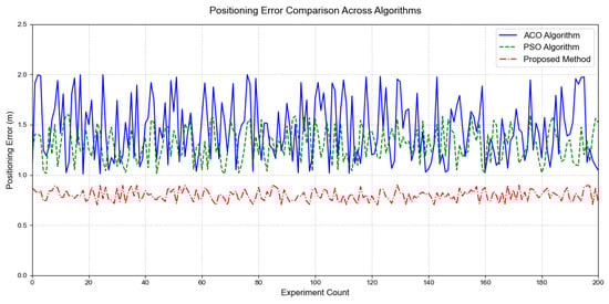 A total of 600 localization experiments were conducted by randomly adjusting the position of the target node and the position of the interfering objects before conducting the experiments. The three algorithms performed the localization of the target node in the same scenario, derived the localization error values, respectively, and finally calculated the mean value of the error for the localization experiments in all cases, randomly taking 200 times. The errors in all cases are shown in Table 4, where the first column is the ACO algorithm, the second column is the PSO algorithm, and third column is the algorithm of this paper. Figure 12 illustrates the comparison of localization errors among the three algorithms.