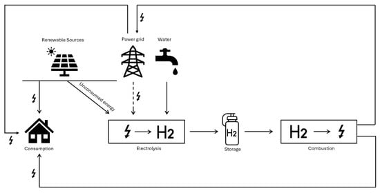 The proposed system consists in a hybrid energy solution that integrates renewable production, the main grid, and a hydrogen storage system. As illustrated in Figure 1, it consists in six main blocks: renewable generation, the consumer building, an electrolyzer for hydrogen production, a hydrogen storage tank, a fuel cell, and the connection to grid.