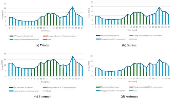 Case Study I is based on the actual technical characteristics of equipment currently available on the market. The aim is to understand how the system would behave when operated with real parameters. Figure 2 shows the hourly distribution of energy consumption in Case Study I for the four seasons of the year. In all seasons, there is a strong dependence on energy purchased from the electricity grid, particularly in the early and late hours of the day, when there is no photovoltaic production. During the daytime, there is greater penetration of solar energy, especially in spring and summer, which allows for a reduction in the use of the grid during these periods.