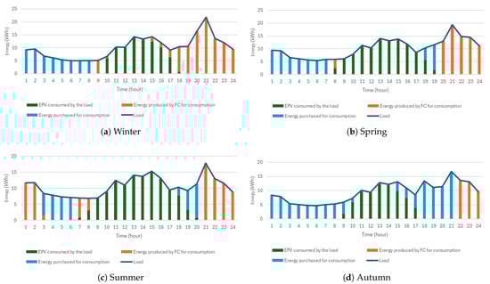 It is important to note that summer was the only season of the year in which energy was sold. In this season, the model considered it more advantageous to sell the surplus renewable energy rather than use it to produce more hydrogen, as can be seen in Figure 5. It can also be seen that it is in the summer that the highest consumption of hydrogen through the fuel cell occurs. This is due to the fact that, during the previous seasons, a sufficient amount of hydrogen was stored to power the load at specific times during this season.