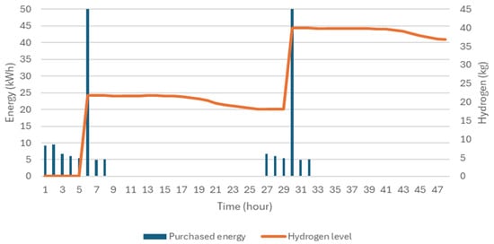 Evolution of purchased energy and hydrogen level in Case Study II. Note: The left vertical axis limit has been reduced to improve the visibility of the blue columns, as one of the purchased energy values has a significantly higher peak.