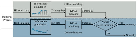 As illustrated in Figure 1, the proposed method follows a two-phase workflow comprising offline modeling and online detection. In the offline modeling phase, historical process data are first processed through information granulation, which structurally abstracts raw time series into compact and meaningful representations. These granulated training data are then used to construct a KPCA model, where the RBF kernel enables the capture of nonlinear inter-variable dependencies in a high-dimensional feature space. Control thresholds are also computed based on the distribution of monitoring statistics derived from the training set. In the online monitoring phase, real-time data are continuously granulated in the same manner, and the granulated test data are projected onto the KPCA feature space using the pretrained model. Monitoring statistics are then computed and compared against the thresholds. If any statistical values exceed the thresholds, the process is flagged as an anomaly; otherwise, it is considered to be operating normally. The synergy between information granulation and KPCA not only achieves a balance between feature abstraction and structural preservation, but also enhances the model’s accuracy and adaptability in identifying diverse anomaly patterns and multivariate dependencies in a complex industrial process. The main contributions of this work are as follows:
