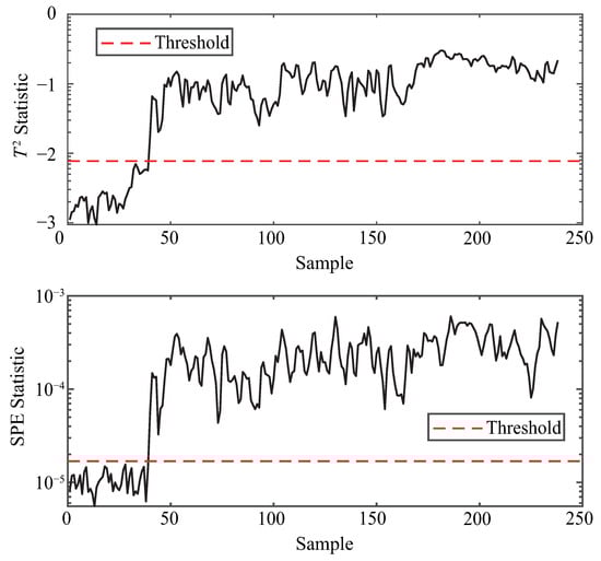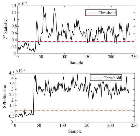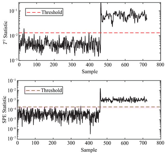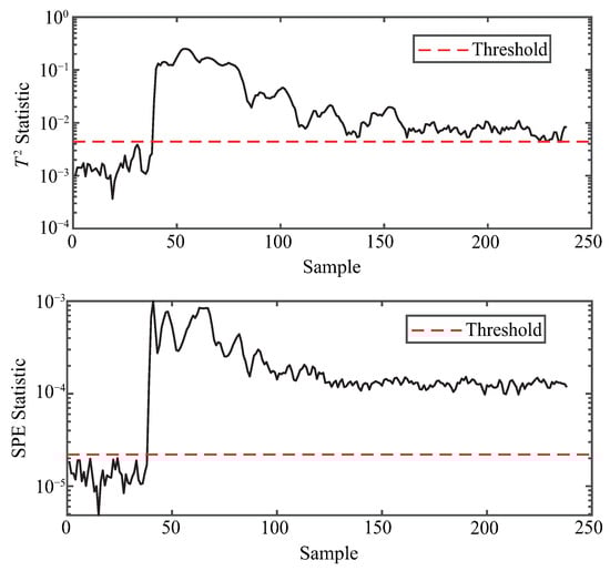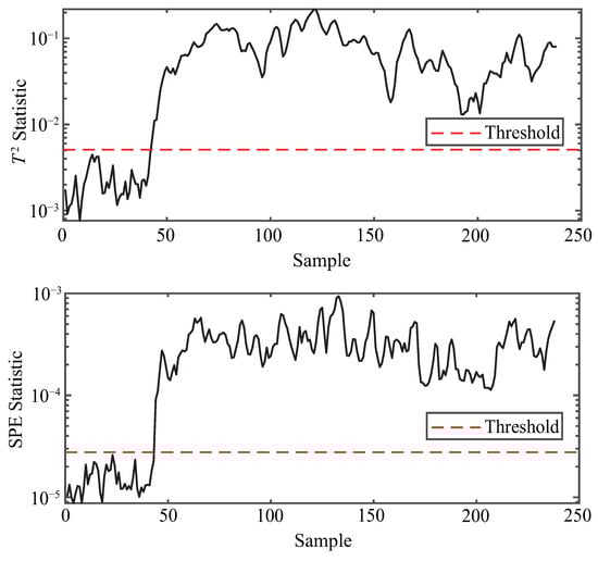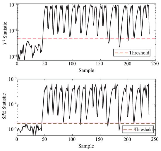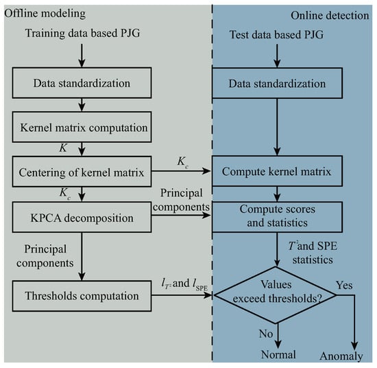 To ensure reproducibility, the thresholds in this study are determined by the classical principle [,]. Specifically, both and are set to 3 so that the control limits are defined as the sample mean plus three times the standard deviation, which covers approximately 99.7% of normal samples under Gaussian assumptions. The anomaly detection procedure based on KPCA is illustrated in Figure 3.