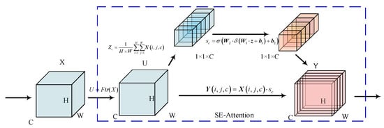 Where the input feature map is , represent the height and width of the feature map, and is the number of channels; the output feature map of the SE-Attention is , having the same shape as the input. The input feature map first undergoes a convolution operation to extract features. A part of the output goes through the Squeeze and Excitation operations to obtain attention weights , as shown in the upper branch of Figure 4. The other part is not processed and is multiplied element-wise with the attention weights , resulting in the final output feature map.