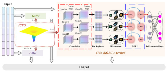 This study employs ICPO to optimize the key hyperparameters of GMM, FMD, and the CNN-BiGRU-Attention model, as illustrated in Figure 6. The range of hyperparameters used in the experiments is determined based on multiple simulation trials and empirical selection, ensuring that the optimized decision variables do not fall on the boundary of the defined range. Further details can be found in Section 3.3.