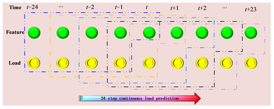 This study utilizes the Belgium 2018 annual load dataset for interval-based time-series load forecasting (detailed data encoding in Section 3.1), with data sources from Elia Company (load and partial characteristics) [43] and “TimeAndDate” website (climate characteristics) [44]. The input sequence is constructed by combining the features and load values from the previous 24 h with the features of the current time step. The step size is set to 1 h, generating 24 forecasting results to obtain the load forecasting for the target day, as illustrated in Figure 7. In Figure 7, green and yellow dots represent the vectors and values of features and loads from time t-24 to time t+23, respectively.