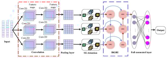 Bidirectional Gated Recurrent Unit (BiGRU) is an improvement over the Gated Recurrent Unit (GRU), serving as a bidirectional variant of the GRU algorithm. BiGRU can simultaneously capture dependencies between past and future time steps. In contrast to the traditional unidirectional GRU, which can only learn from past information, BiGRU processes data bi-directionally, enabling it to capture better the bidirectional dependencies in electricity load data [37]. This characteristic is crucial in handling electricity load data with complex temporal dependencies. Its basic structure is illustrated in Figure 3.