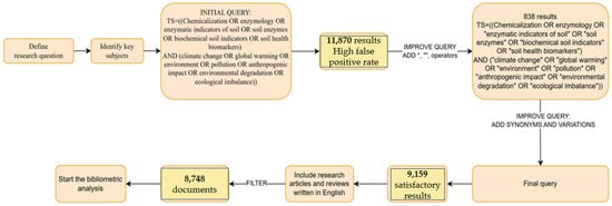 The Boolean operator ‘AND’ was employed to restrict the results to articles containing terms from all categories, thus ensuring thematic relevance. The ‘OR’ operator was used to expand the search within each category to include synonyms and related terms. Quotation marks were employed to search for exact expressions, while the asterisk (*) functioned as a truncation operator, facilitating the inclusion of all variants of a word (e.g., fertiliz* includes fertilization, fertilizer, fertilize, etc.). Figure 1 illustrates our systematic approach to developing and refining the search strategy.