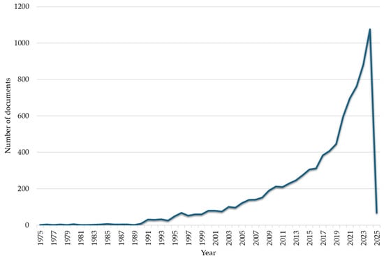 Data were extracted from the WoS Core Collection database on 18 January 2025. While our temporal scope spans 1975–2025, it is important to note that 2025 data represent a partial-year snapshot captured at the time of extraction, containing only publications indexed through mid-January 2025. The inclusion of this partial 2025 data was deemed valuable for capturing the most recent research trends, while acknowledging the inherent limitation that publication and citation count for 2025 are necessarily incomplete. This temporal specification ensures reproducibility, as researchers accessing the same database query on the specified extraction date would obtain identical results.