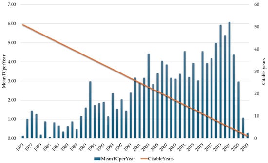 Citation dynamics: trends in MeanTCperYear in the researched field (1975–2021).