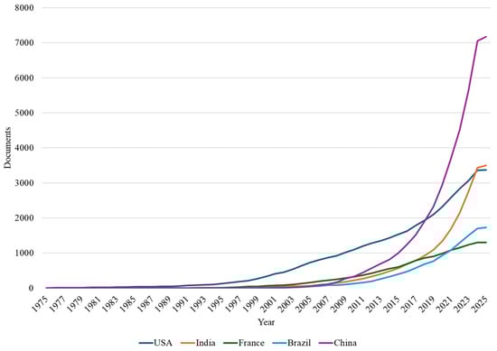 Country-specific contributions to soil chemicalization research over time (1975–2025).