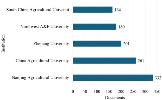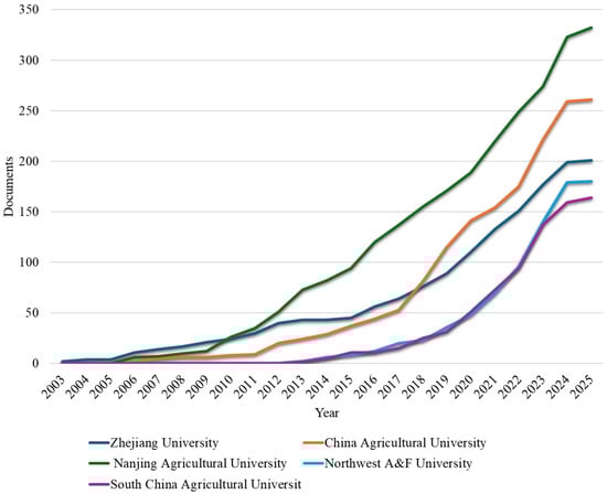 The bibliometric analysis of document production over time indicates that Chinese institutions, although starting their publications in this field later (as shown in Figure 6), began publishing in 2003. From 2003 to 2010, the publication output was relatively modest, with fewer than 20 publications annually across all institutions, and little differentiation among the top five Chinese universities. This initial phase suggests an emerging focus on soil chemicalization research within China’s agricultural research framework. The period from 2011 to 2015 marked the onset of institutional stratification, with Nanjing Agricultural University taking an early lead in the field. The most significant expansion in research output occurred after 2015, characterized by rapid growth across all institutions. Nanjing Agricultural University maintained its leadership, experiencing particularly strong growth from 2019 onwards and reaching approximately 320 publications by 2025. Figure 7 illustrates the scientific production over time of the top five most productive institutions.
