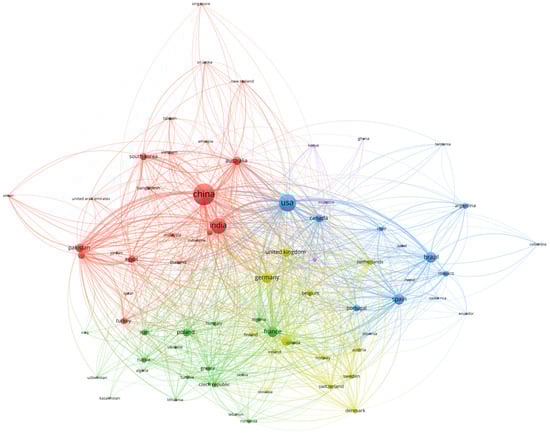 The analysis indicates that collaboration among authors from different countries is essential for achieving high-impact results, with technology transfer contributing to the enhancement of document quality. China emerges as the largest node with extensive red connections, signifying its status as the primary research hub in this field. The USA represents another significant hub with blue connections, indicating robust international collaboration. India, positioned between the Western and Asian specific clusters, appears to serve as a conduit between these two regions. The red cluster, under Chinese leadership, appears to consist predominantly of Asian countries, the blue cluster, led by the USA, appears to be dominated by Western countries, and the green and yellow clusters appear to include a significant proportion of European countries. This multi-polar collaboration structure facilitates global knowledge exchange and reflects the transnational nature of soil chemicalization challenges, where environmental problems transcend national boundaries and require coordinated international research efforts to develop effective solutions. Figure 8 presents the global research collaboration network in the field of soil chemicalization, for the articles identified by the search algorithm.