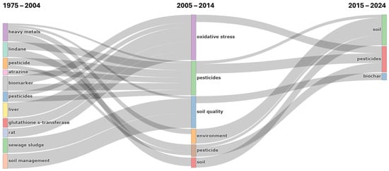 The third period (2015–2024) represents the solutions-oriented acceleration phase, where soil health emerged as the primary theme alongside persistent pesticide concerns. The prominent emergence of biochar research reflects the field’s evolution toward sustainable remediation approaches, demonstrating maturation from problem identification to practical solution development. The overall thematic evolution demonstrates a clear progression from pollutant-focused research through mechanistic understanding to solution-oriented approaches, reflecting the field’s development from environmental problem documentation to sustainable intervention strategies.