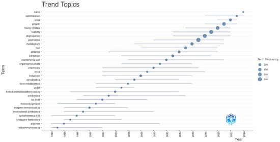 The temporal evolution of topics of interest demonstrates an advancement from methods such as radioimmunoassay to more intricate immunological methods, including enzyme-linked-immunoassay and enzyme-linked-immunosorbent-assay, in addition to biochemical analysis that references cytochrome-p-450 liver microsomes and monooxygenase. This progression signifies an augmented interest in the detection of substances of interest to ascertain their impact on biological systems. Moreover, the progression has been further fueled by the emergence of increasingly sophisticated techniques for the analysis of xenobiotics and pesticides, with a particular emphasis on the study of their toxicity and degradation in the environment. The data demonstrate a marked increase in research activities related to heavy metals and the optimization of detection methods, culminating in the recent advent of nanoscale technologies. It is also important to note the parallel development of studies on test organisms such as fish, yeasts and Escherichia coli, which have allowed a better understanding of the effects of these contaminants on living systems. This evolution reflects the field’s transition from primarily analytical and detection-focused research to application-oriented studies aimed at developing practical solutions for agricultural sustainability and environmental protection.