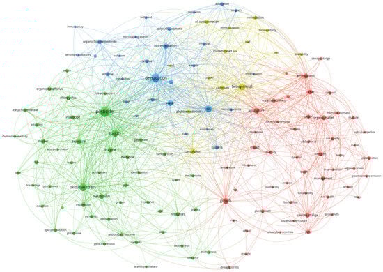 Keyword co-occurrence network representing research themes in soil chemicalization (100-occurrence threshold). Four primary clusters emerged: pesticide toxicity and biochemical impacts (red), degradation and bioremediation strategies (blue), agricultural sustainability and soil management (yellow), and heavy metal contamination (merged into yellow at this threshold). Node size reflects keyword occurrence frequency; edge thickness indicates co-occurrence strength. Sensitivity analysis (20–150 occurrences) confirmed stability of core thematic groupings while showing expected variation in peripheral keyword inclusion (Supplementary Figure S1, Table S1).