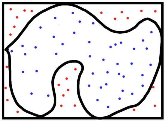 A more complicated example that comes up is estimating area. Consider the shape in Figure 1. We might feel stuck trying to estimate its area. A Monte Carlo method for estimating the area is to select uniformly distributed random points in a rectangle around the shape. The proportion of dots within the shape is asymptotically equal to the proportion of the area of the shape to the rectangle, and hence, one can use this proportion to estimate the area.