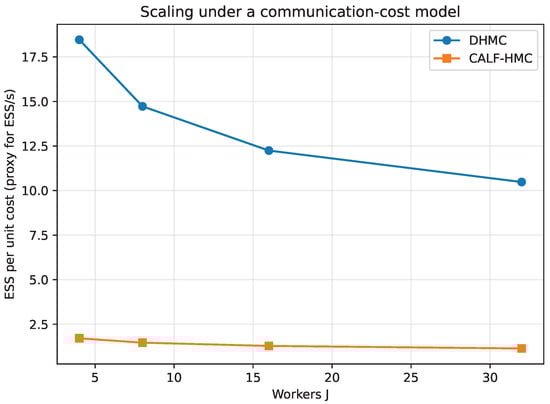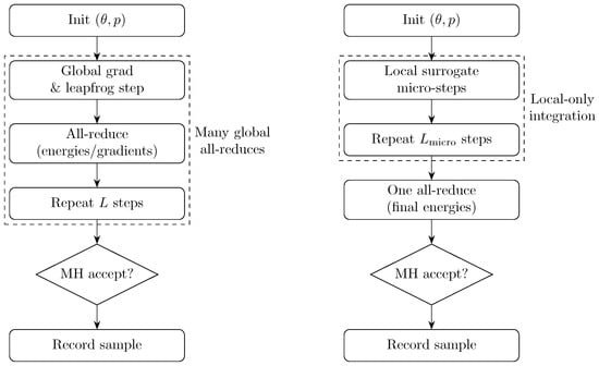 Beyond CPU clusters, the communication-aware perspective extends naturally to GPU-accelerated and heterogeneous environments, where kernel launch latencies and device interconnects (e.g., NVLink) reshape the communication cost model; amortized synchronization in CALF-HMC is directly applicable. Privacy-preserving and federated Bayesian inference also benefit: By design, global corrections aggregate only reduced statistics (energies/gradients), enabling secure aggregation backends. A promising line of work is to employ adaptive surrogate models (e.g., low-rank plus diagonal or neural approximations) with periodic refresh to sustain high acceptance at minimal synchronization frequency. Finally, benchmarking against distributed probabilistic programming frameworks will provide broader external validation and stress-test portability across runtimes.