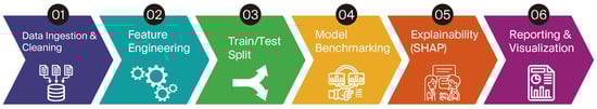 To ensure reproducibility and modularity, we designed a structured pipeline that combines all stages of the dropout prediction task, from raw data ingestion to interpretability analysis. This pipeline follows the principles of transparent and reproducible machine learning research in education [35,37]. It was implemented entirely in Python 3.12.0 using open-source libraries like scikit-learn 1.7.1, xgboost 3.0.3, and shap 0.48.0.