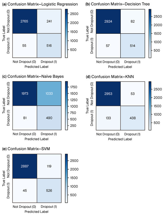 Confusion matrices (classical models) at the operating threshold used in Table 4. Cells show counts of TP, FP, FN, and TN; darker shading indicates higher counts. False negatives (FNs) are critical in early-warning use (missed at-risk students).