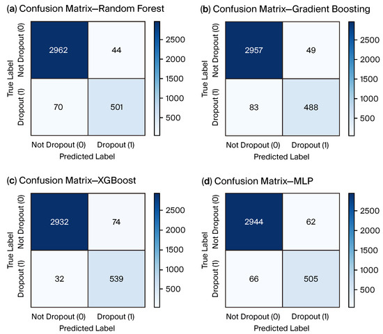 - Mojumder Anik, M.S.; Israt Zerin, S.; Ayman, U.; Muntakim, M.A.; Atif Asif Khan Akash, M.; Imam Bijoy, M.H. Dropout prediction of university students in Bangladesh using machine learning technique. In Proceedings of the 2025 International Conference on Electrical, Computer and Communication Engineering (ECCE), Cox’s Bazar, Bangladesh, 27–29 February 2025; Institute of Electrical and Electronics Engineers (IEEE): New York, NY, USA, 2025; pp. 1–6. [Google Scholar] [CrossRef]