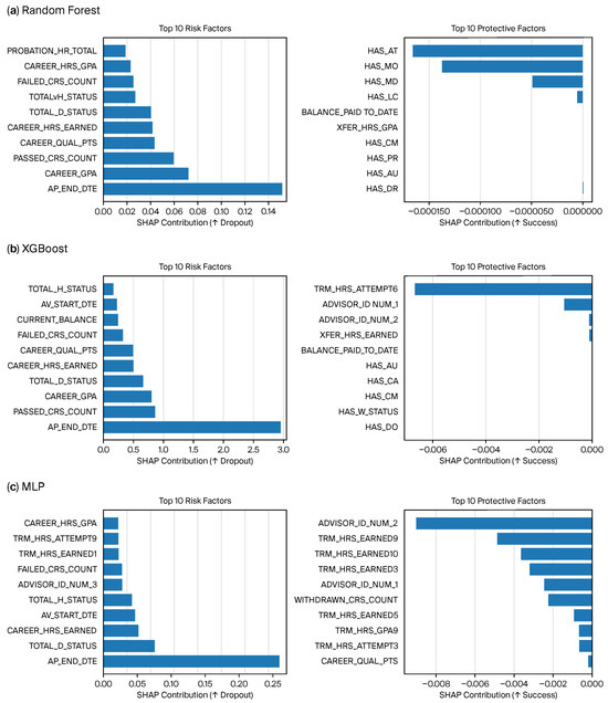 Research has made progress, but multiple gaps continue to exist in the existing literature. The models of Hassan’s Somaliland survey [19] and El Mahmoudi’s Moroccan study [20] demonstrate high accuracy in their specific settings, yet they fail to transfer effectively between institutions, cultures, and different educational levels. The Bi-LSTM [24] and Kanformer [25] deep learning models demonstrate high accuracy, but their high computational requirements and tendency to overfit make them impractical for educational settings. Additionally, interpretability is still lacking. SHAP and LIME have gained popularity, but researchers typically implement them as additional components after model development instead of incorporating them into the initial model framework, and their effectiveness for non-technical users remains uncertain [28,29]. The development of reliable EWSs requires anomaly detection, ambiguity analysis, and longitudinal validation methods, yet these methods remain underutilized. The distinction between risk factors (dropout-related variables) and protective factors (dropout-reducing variables) remains unclear in most studies, although this distinction is vital for developing student-centered interventions. Recent studies [30,31] have reaffirmed the strength of tree ensembles on structured higher education institution (HEI) data but have stopped short of integrating governance diagnostics, subgroup fairness tables, and external replication within a single modular framework.