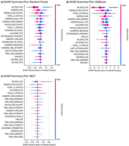 Students on academic leave remain labeled 0 (persist/graduate) unless administratively withdrawn by the registrar. Some administrative hold codes (HAS_*) are institution specific, while academic performance features (e.g., GPA, credits, and failures) are broadly transferable across HEIs. Ground-truth outcomes were taken from the institution’s registrar outcome field STUDENT_STATUS at the end of the observation window defined for this study. Labels were assigned post hoc with no access to model features at inference time: indicates students recorded by the registrar as having eventually discontinued studies (dropout), while denotes students who persisted or graduated within the window. The outcome field was used solely to define y and was not included among predictor features. After cleaning and curation, the modeling matrix comprised students and features. The positive class contained 2856 students (16.0%). We used a stratified 80/20 split, yielding 14,306 training and 3577 test students (positives ≈ 2285 train/571 test). Class imbalance informed the evaluation choices (ROC thresholded metrics) and motivated post hoc explainability to support case review and governance. A compact summary follows in Table 1.