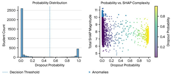 The current study builds upon previous machine learning research [17,18] and essential XAI frameworks [32,33,34] to address the identified gaps. Our research enhances both methodological quality and practical use through the evaluation of classical, ensemble, and deep learning models in a modular system and the implementation of SHAP-based analyses for feature attribution and anomaly detection and ambiguity analysis. The research identifies both risk and protective factors. The research provides useful insights that exceed black-box predictions and delivers reliable, easy-to-understand tools that match the needs of educators and policymakers in their specific contexts.