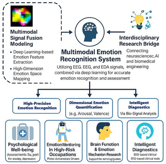 To overcome these challenges, recent studies have investigated fusion techniques for multimodal physiological signals. Traditional emotion recognition relying on a single physiological modality is highly susceptible to environmental noise, limiting its ability to reliably detect nuanced affective states. Empirical comparisons demonstrate that multimodal fusion approaches consistently outperform unimodal methods in recognition accuracy across diverse datasets. This superiority arises from two key factors: one being the complementary nature of multidimensional emotional features extracted from different modalities, and the other the ability of cross-modal interaction modeling to reveal latent correlation patterns, thereby improving model generalizability. Advanced research further indicates that multimodal fusion optimizes joint feature representations, which not only increases robustness against noise but also constructs a richer emotional feature space. This space combines intra-modal discriminative attributes with inter-modal relational features, resulting in substantially enhanced emotion classification performance [8]. The application field of multimodal emotion recognition is shown in Figure 1.