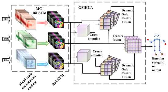 The design philosophy of the GMHCA module originates from multimodal learning theory, particularly the concepts of Cooperative Representation Learning and Cross-Modal Alignment. Different modalities such as EEG (reflecting brain activity), EOG (eye movement behavior), and EDA (electrodermal activity) are complementary in the process of perceiving emotions; they capture emotion-induced physiological changes from different perspectives. Therefore, in the fusion stage, the unique discriminative features of each modality should be preserved, and a fused space with cooperative representation ability should be constructed. Furthermore, from the perspective of information theory, the complementarity between modalities can be quantitatively modeled through mutual information (MI) [34]. If the MI between two modalities is low, it indicates that they share less information and have low redundancy, and their integration can yield richer emotional representation features. The dynamic gating mechanism introduced in GMHCA is based on this principle. By calculating the difference index between modalities and combining attention features, it adaptively adjusts the contribution weights of each modality, highlighting the role of modalities with strong complementarity in the final classification, thereby improving the overall discriminative performance. Meanwhile, to address the issues of a single perspective and limited expressive power in traditional single-head attention in cross-modal modeling, GMHCA has designed a multi-head parallel mechanism, enabling the model to capture complex nonlinear modal interactions across multiple feature subspaces. Each attention head models the semantic dependencies between modalities from different perspectives, while the gating mechanism further controls the transmission of redundant information and enhances the modeling ability of key interaction channels. Based on this theoretical framework, the specific components of the proposed model are detailed below, including the MC-BiLSTM network (Section 3.2) and the GMHCA module (Section 3.3).