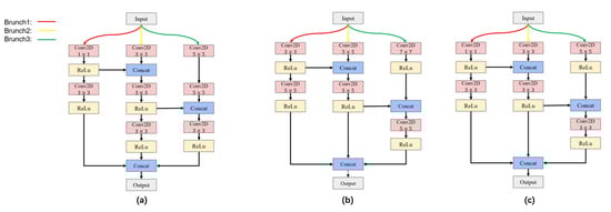 For the feature differences among EEG, EOG, and EDA signals, this paper designs targeted multi-scale convolutional schemes. EEG signals exhibit neural electrical activity with millisecond-level temporal precision, where discriminative features span multiple timescales—from short-term transient events (e.g., event-related potentials) to long-term slow cortical potentials. Similarly, EOG signals reflect eye movements characterized by rapid, discrete artifacts such as blinks and saccades, which possess distinctive temporal morphologies. The raw physiological signals contain multi-scale temporal patterns that are critical for emotion recognition. To effectively capture these multi-scale patterns, we designed a multi-scale convolutional module. Therefore, in designing the multi-scale convolutional module, Branch 1 employs 1 × 1 and 3 × 3 convolutional kernels to extract local detailed features and achieve cross-channel information fusion, Branch 2 gradually expands the receptive field while maintaining resolution through two stacked 3 × 3 convolutions to capture medium-range temporal dependencies, and Branch 3 further extends the receptive field using a 5 × 5 convolution to capture longer contextual information. Finally, the outputs of the different branches are fused via feature concatenation, forming a rich multi-scale representation that significantly enhances the model’s ability to characterize both transient activities and sustained patterns, as shown in Figure 3a,b. In contrast, as a low-frequency signal, EDA primarily reflects changes in skin conductance and is closely associated with sympathetic nervous activity. Its phasic and tonic components evolve slowly, requiring a larger receptive field to capture long-term trends. To this end, Branch 1 utilizes 3 × 3 and 5 × 5 convolutional kernels to capture both local fluctuations and medium-range variations, Branch 2 employs a 5 × 5 convolution to extract patterns at intermediate temporal scales, and Branch 3 adopts a 7 × 7 kernel to comprehensively cover slow long-term trends, thereby effectively characterizing skin conductance responses related to emotional arousal. This design enables the model to adaptively extract features aligned with the inherent properties of the signal, providing information-rich and highly discriminative multi-scale feature representations for subsequent temporal modeling with BiLSTM, as shown in Figure 3c.