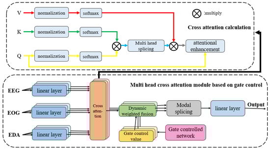 where CrossAttention is the function, a and b are weight values, is the transpose of K, d is the feature dimension, headi represents the output of the i-th attention head, and , and are the Q, K, and V values of the i-th attention head, respectively. The dot product of Q and first computes the attention weight matrix through the softmax normalization function, multiplies it with the value vector V, and then performs weighted fusion with the original query vector Q to generate the output of a single attention head, headi. Finally, by concatenating the results of all attention heads, a complete multi-head cross-attention representation is constructed. Considering the complementarity differences among multimodal physiological signals (EEG, EOG, and EDA), this paper introduces learnable gating units to quantify inter-modal complementarity strength. The implementation is as follows:
