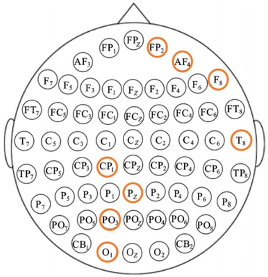 The eight EEG channels selected based on the literature and previous team work are circled in orange in the figure.