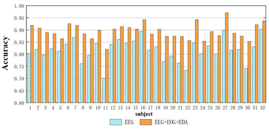 For better visualization, the classification accuracy data for valence dimensions from the 32 subjects using single-modal EEG and multimodal fusion are plotted, as shown in Figure 9. It can be observed that for some subjects (e.g., Subject 11), the classification accuracy increases significantly after three-modal fusion, indicating that their EEG signals may not contain sufficient features, and EOG and EDA signals effectively complement the EEG signals.