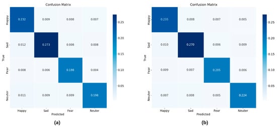 Confusion matrix for single modality and multimodal fusion in SEED-IV dataset: (a) only EEG single modality; (b) multimodal fusion.