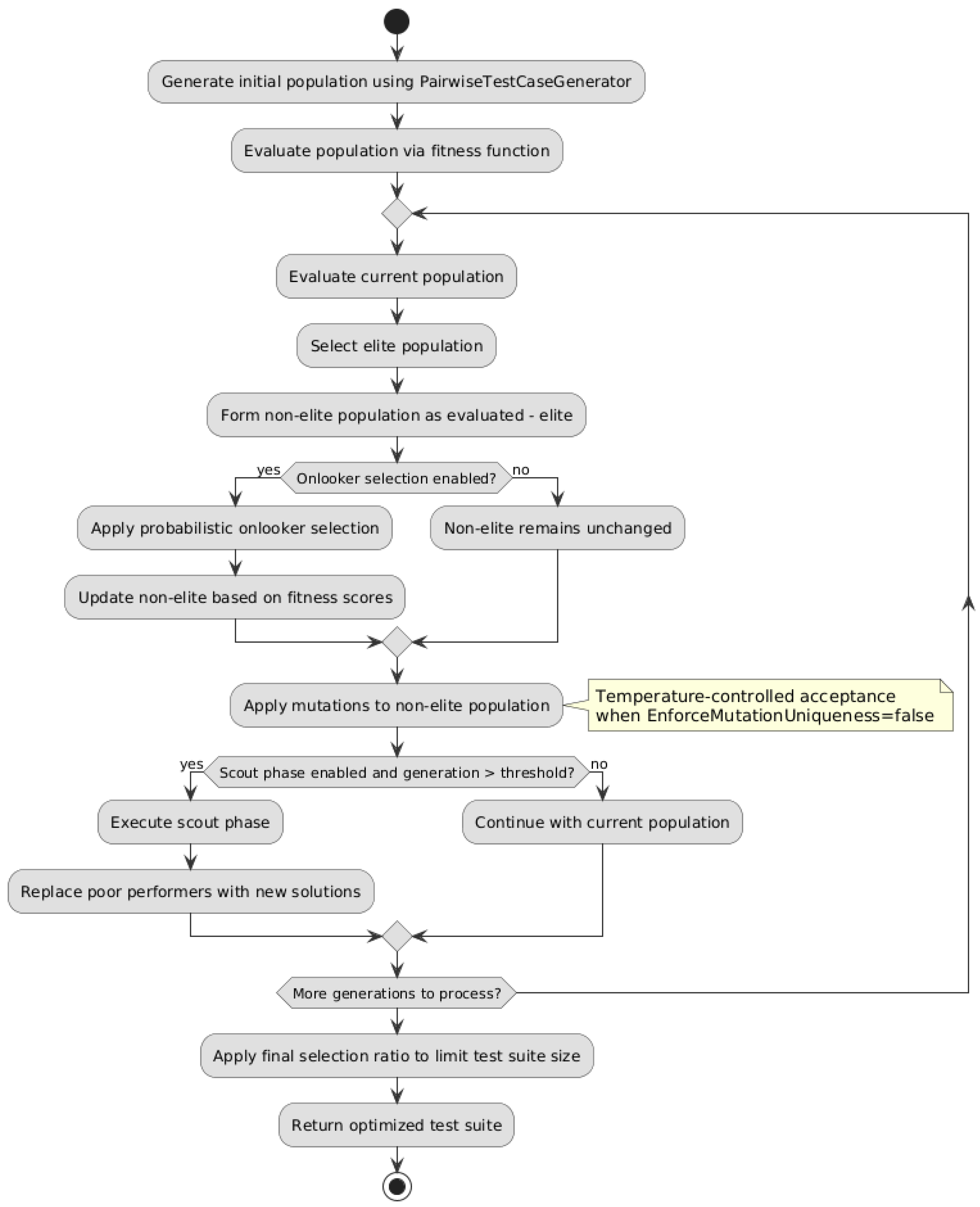 | Input: nonElitePopulation, parameters, iteration Output: updatedPopulation 1: temperature ← max(0.1, 1.0 × CoolingRate^generation) 2: for each original in nonElitePopulation do 3: mutated ← ApplyMutation(original, parameters) // MutationRate check inside 4: if mutated ≠ original and mutated ∉ evaluatedPopulation then 5: originalScore ← Evaluate(original) 6: mutatedScore ← Evaluate(mutated) 7: if EnforceMutationUniqueness then 8: accept ← mutatedScore > originalScore 9: else 10: Δ ← mutatedScore − originalScore 11: acceptance ← exp(Δ / temperature) 12: accept ← Δ > 0 or random() < acceptance 13: end if 14: if accept then 15: Replace original with mutated in evaluatedPopulation 16: end if 17: end if 18: end for |
