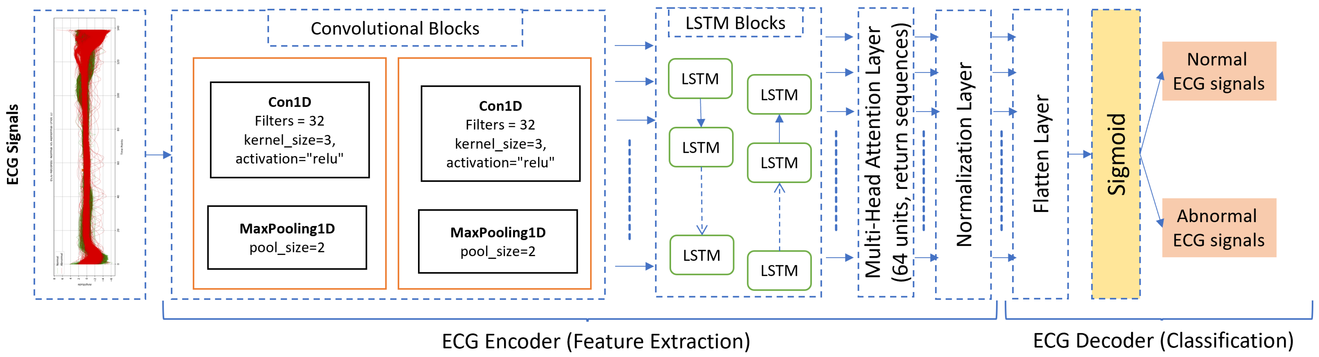 5]. These studies demonstrate the versatility of deep neural models in learning complex signal representations and capturing long-term dependencies, reinforcing the motivation for an end-to-end approach in ECG anomaly detection.