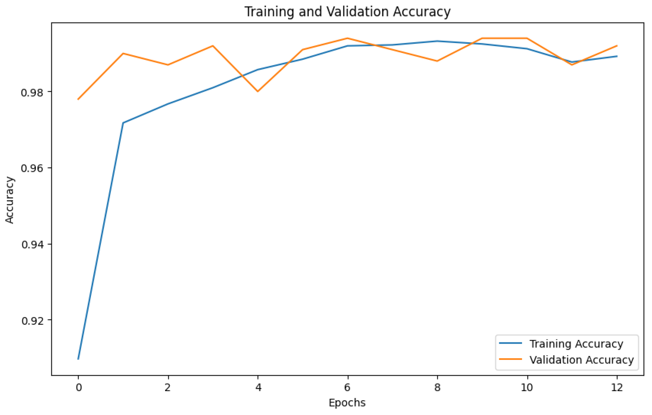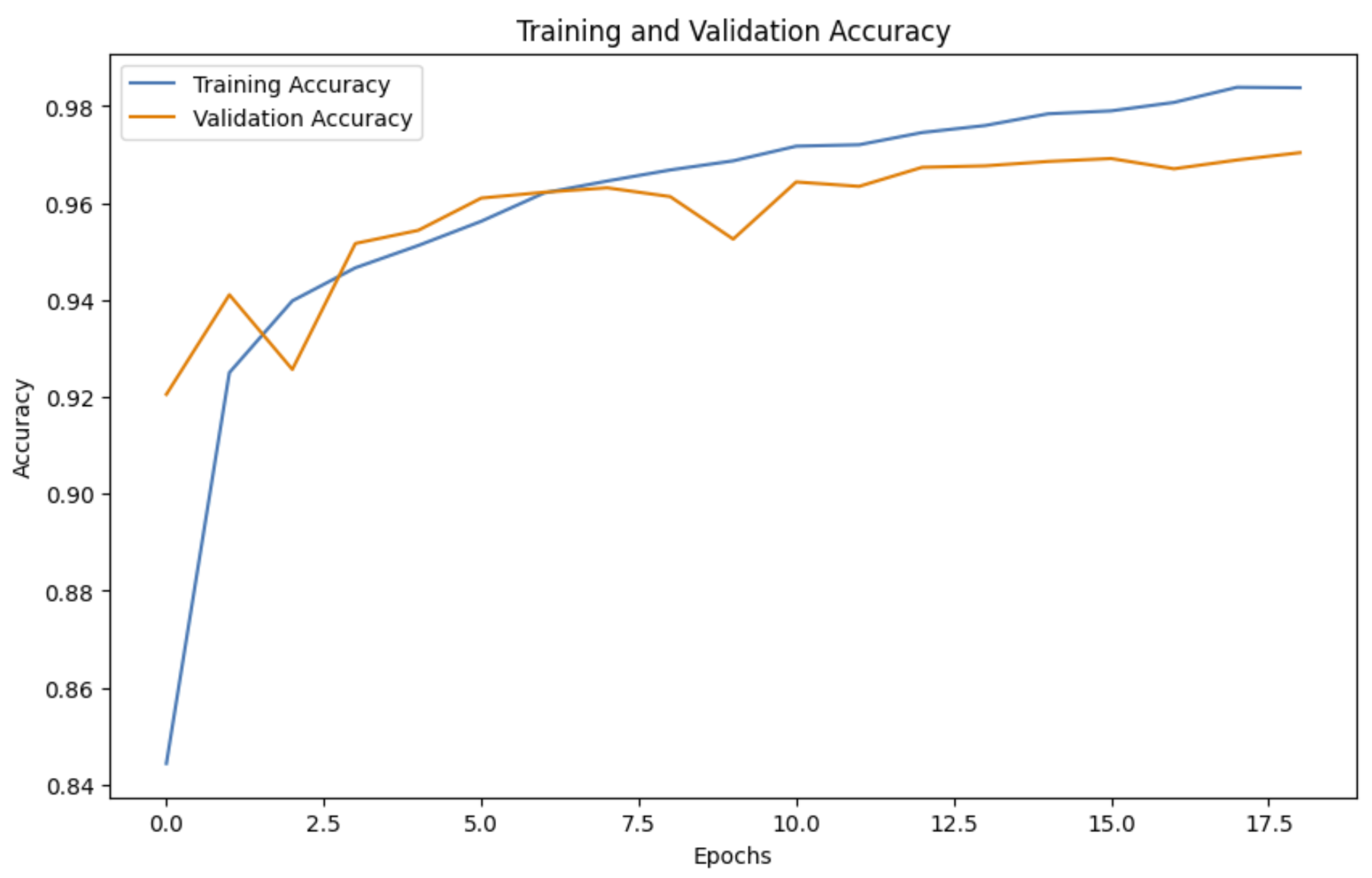 Figure 10 clearly show that both the training and validation accuracy continuously increase over the epochs and eventually stabilize.