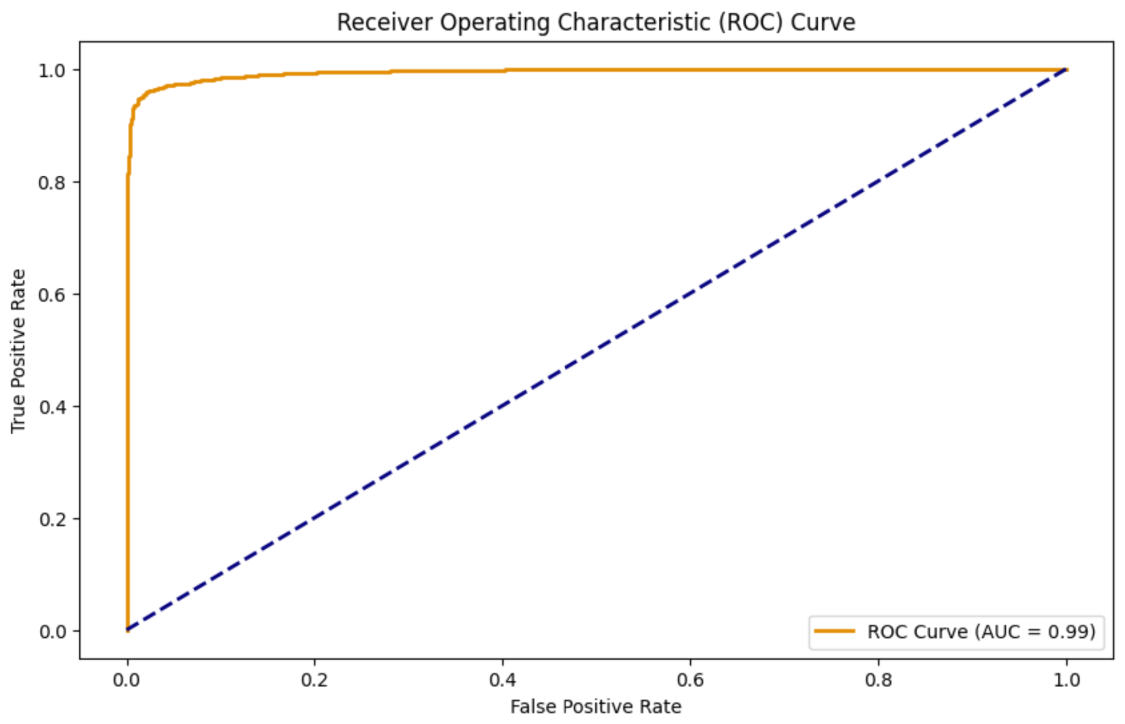 We evaluate the performance of our proposed model using the ROC curve, which illustrates how well the classification model performs across different thresholds. As shown in