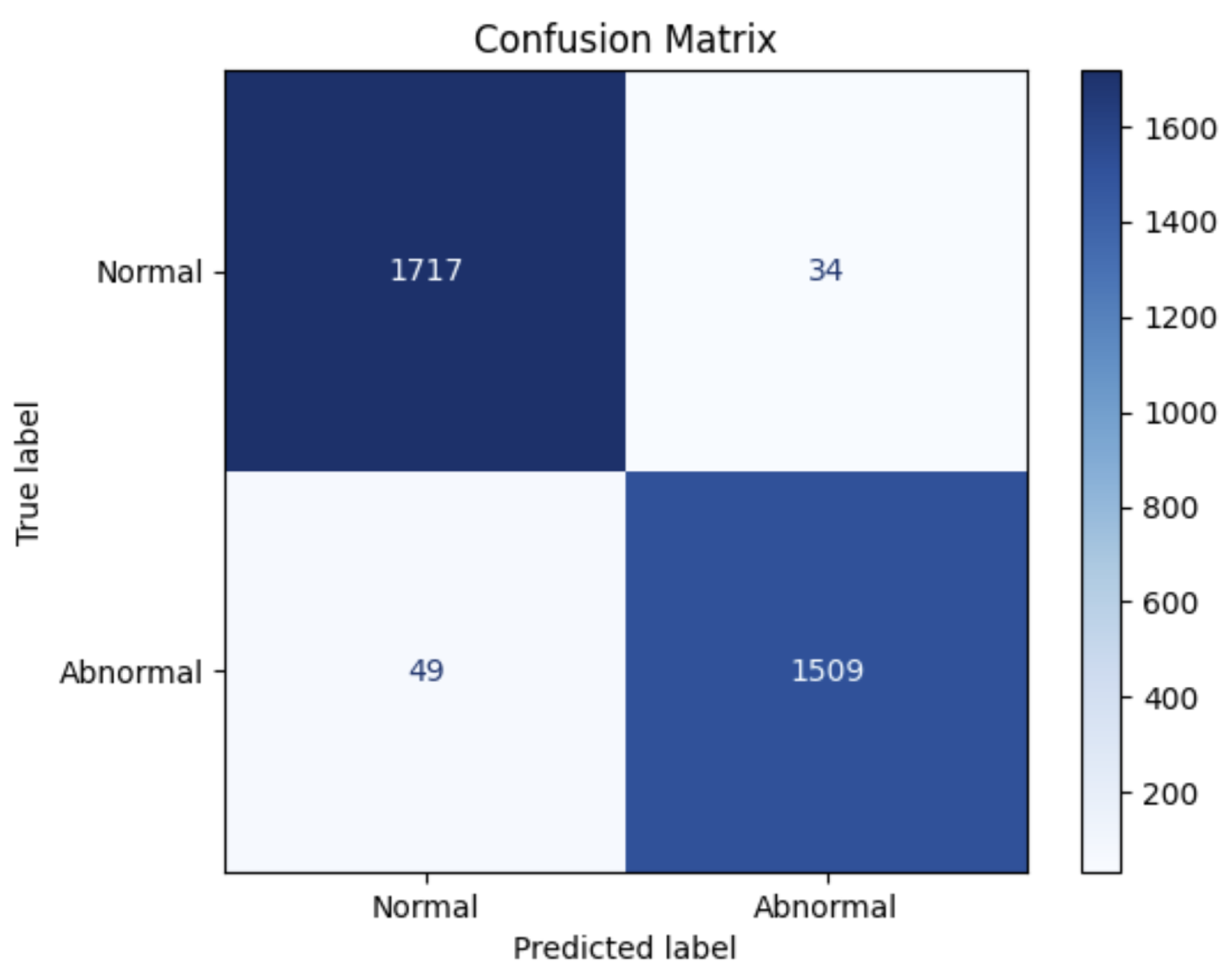 The confusion matrix results demonstrate the strong performance of the proposed ECG-CBA model in classifying ECG5000 test samples into Normal and Abnormal rhythm categories.