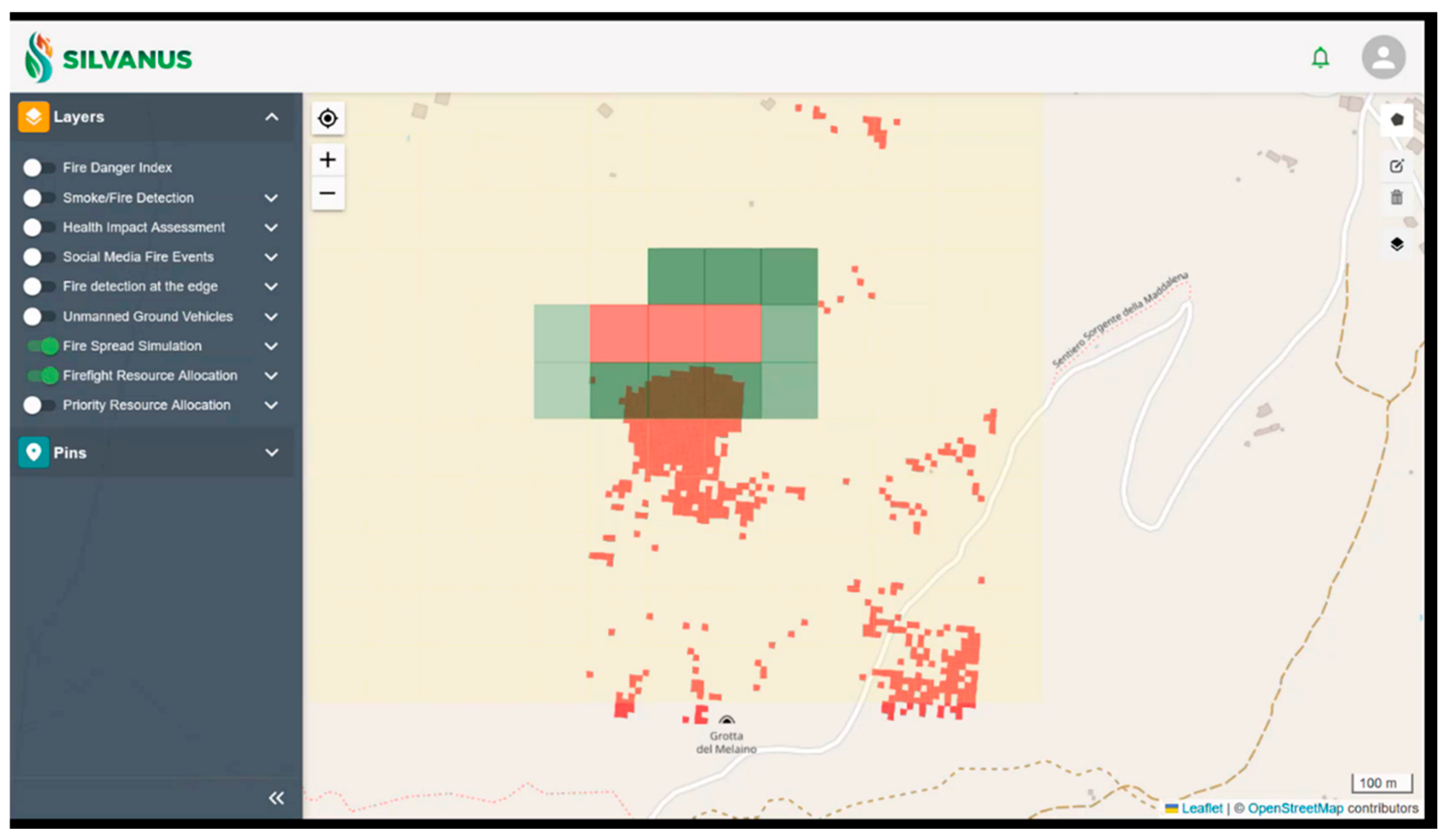 - SILVANUS Consortium. Deliverable D5.3: Demonstration of SILVANUS Decision Support System for Response Coordination; SILVANUS Project, Grant Agreement No. 101037247 (H2020-LC-GD-2020-3); Horizon 2020 EU. Available online: https://silvanus-project.eu/wp-content/uploads/2023/12/SILVANUS-D5.3.pdf (accessed on 10 August 2025).